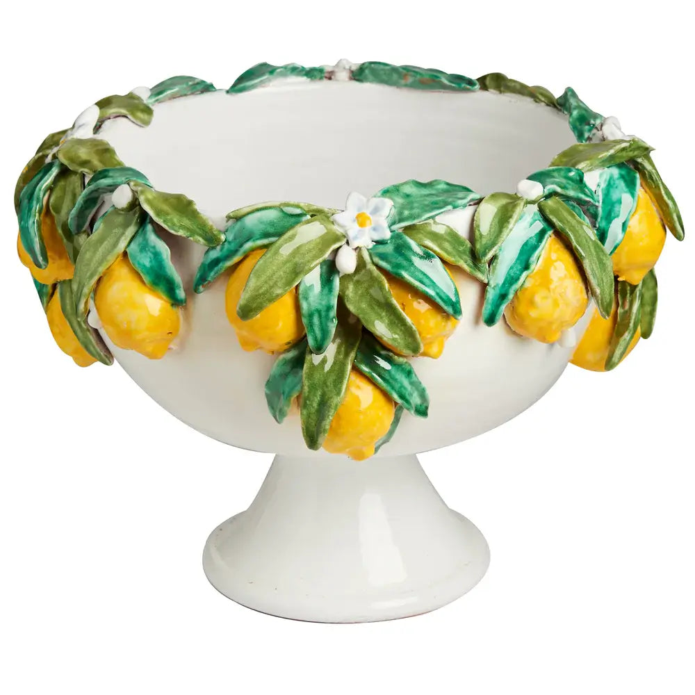 This magnificent Italian ceramic bowl is a sight to behold. With its signature footed base and exquisite hand-crafted lemons and foliage, this glazed bowl breathes magnificence. Dimensions of 16" diameter and 11" height.