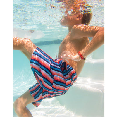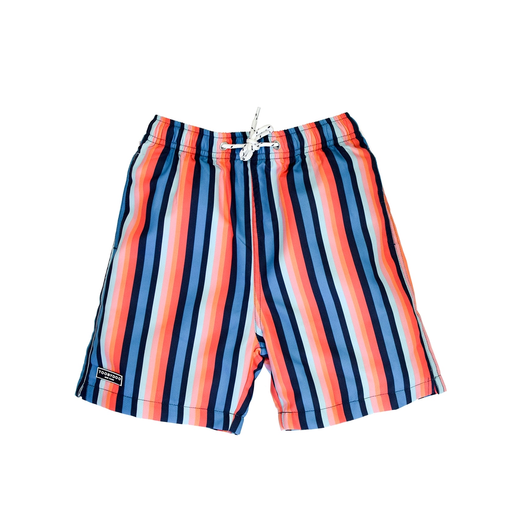 Short de bain Toobydoo l uxury avec imprimé à rayures funk verticales signature Toobydoo . Doté d'une ceinture élastique, d'un cordon de serrage style marin, de poches latérales, d'une doublure entièrement en mesh, de poches arrière avec fermeture velcro, d'œillets spéciaux pour une évacuation rapide de l'air. Le short a un toucher coton et sèche rapidement (100% polyamide).