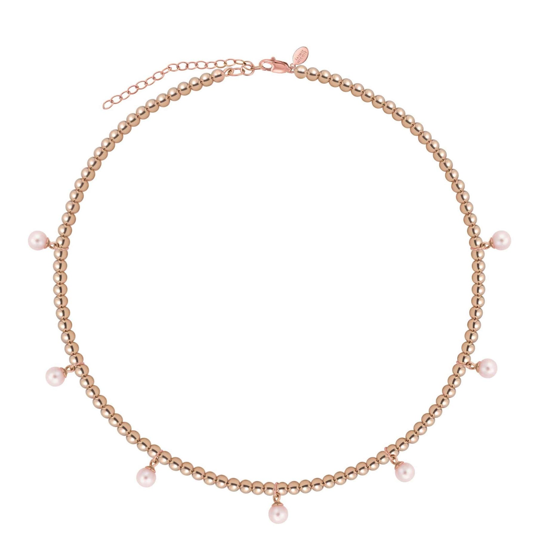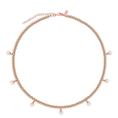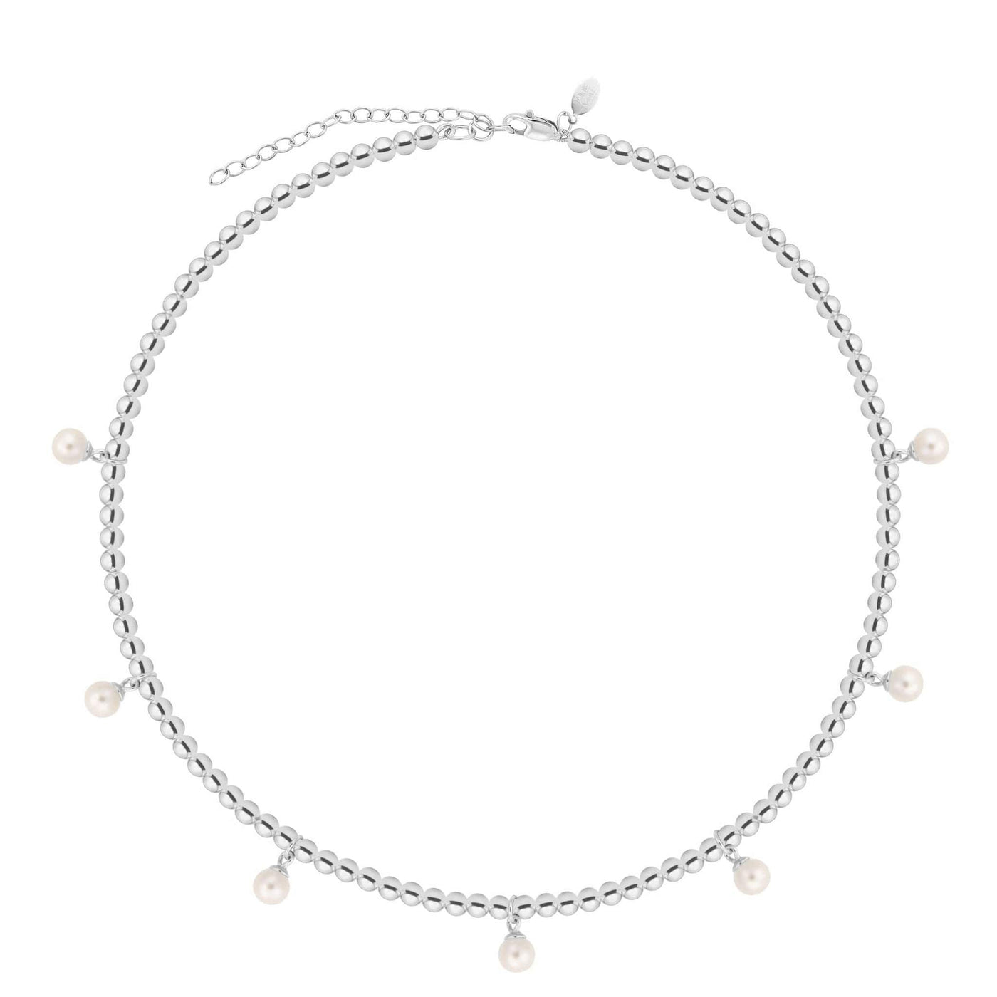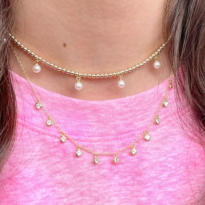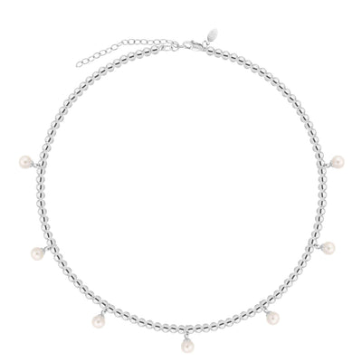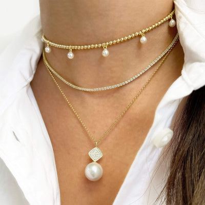 Le collier ras du cou Pearl Chandelier comprend sept breloques en perles d'eau douce pendantes entre les perles.