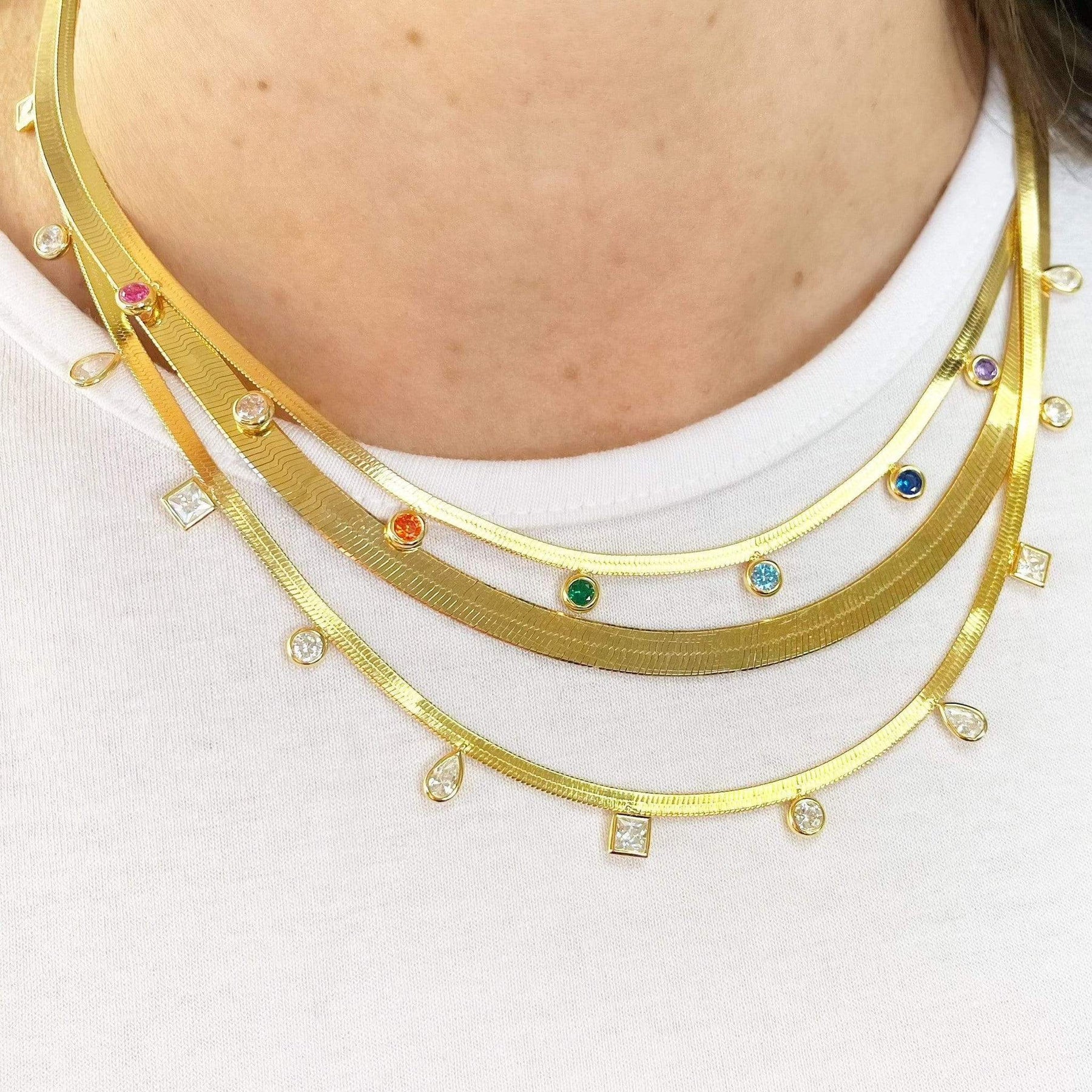 Le collier pendentif à chevrons propose douze breloques éblouissantes fabriquées à partir de cristaux cultivés en laboratoire sans conflit, brillants en argent sterling. Ce collier exquis mesure environ 16 à 18 pouces de long, avec une chaîne de 2,5 mm d'épaisseur qui peut être ajustée avec une chaîne d'extension.