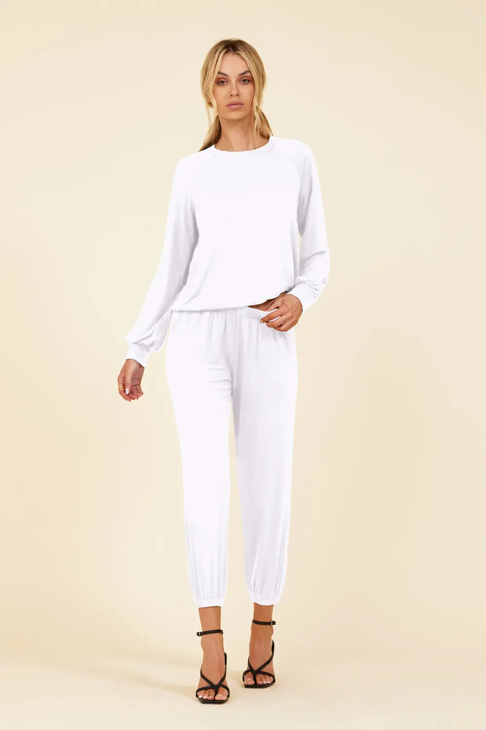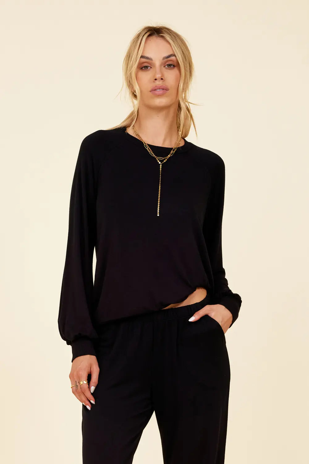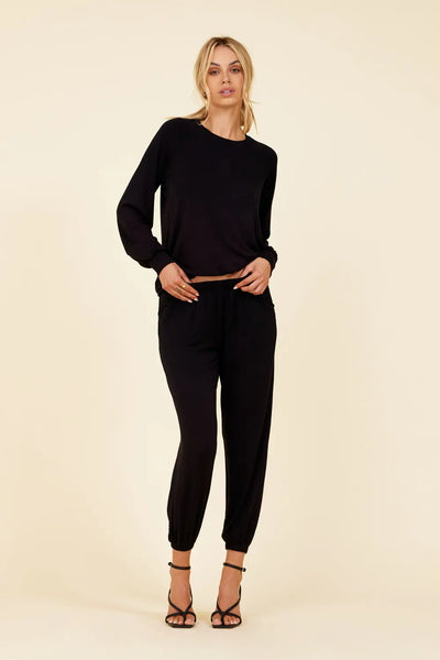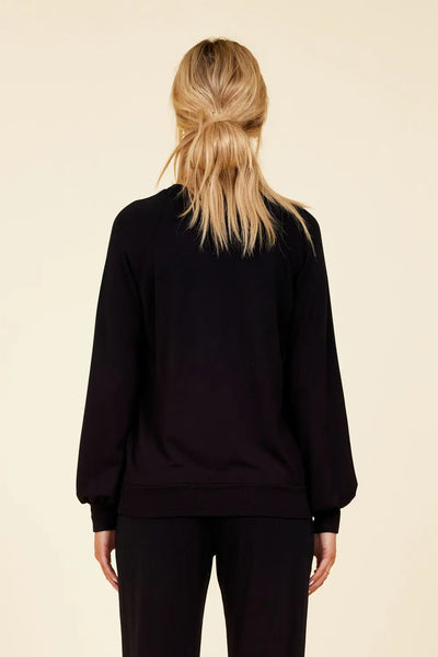 Un pull classique est amélioré avec des manches cloche intemporelles. Le col haut sert de toile de fond parfaite pour les longs colliers et les lariats superposés. Disponible en noir et blanc. Associez-le au pantalon Lounge assorti pour un look décontracté et confortable qui reste néanmoins très chic.