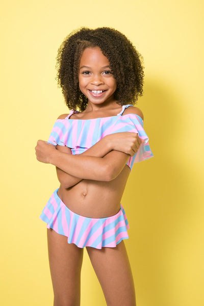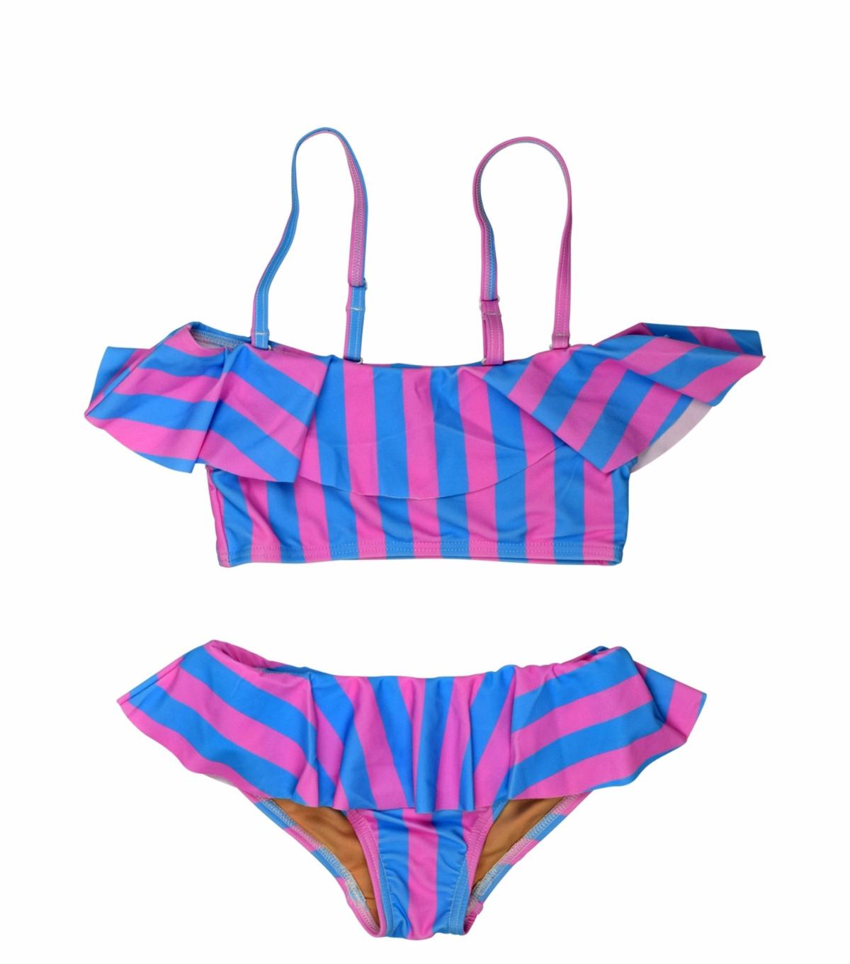 Toobydooun tout nouveau style ! Bikini haut bandeau avec volant et 2 bretelles réglables et amovibles. Portez-le sur les deux épaules, croisé ou sans bretelles ! Bas à couverture complète avec volants supplémentaires avec une taille élastique confortable et un logo Toobydoo imprimé en caoutchouc à l'arrière. Des rayures verticales bleu barbe à papa et roses complètent ce maillot de bain amusant et séduisant. Les deux pièces sont entièrement doublées. Coquille créée en 80% nylon et 20% spandex, doublure en 92% polyester, 8% spandex. Lavage en machine à froid.