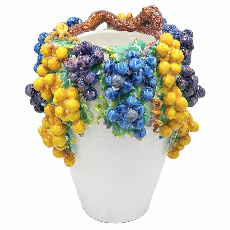 Cet incroyable vase italien est décoré de raisins et de feuilles fabriqués à la main. Il se marie très bien avec le bol sur pied avec des raisins (article n° 233017).