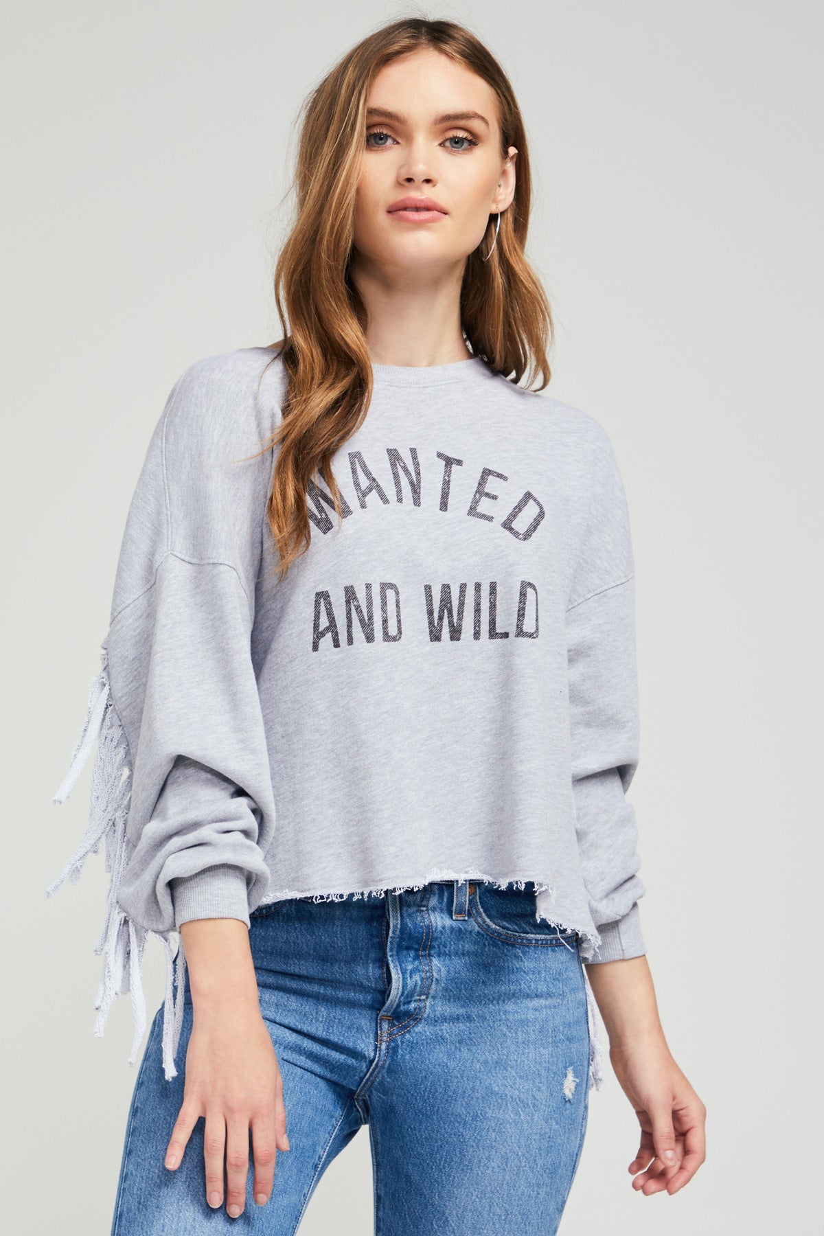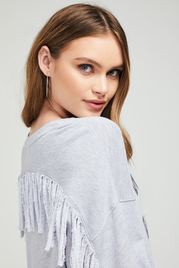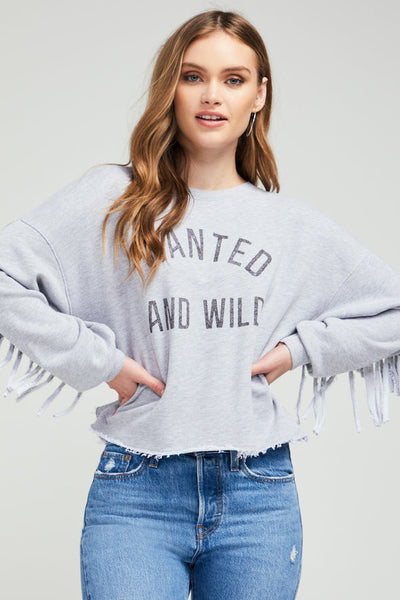 Pas seulement jouer dur pour l'obtenir. Attrape-moi si tu peux. Le sweat-shirt Wanted And Wild Ophelia Fringe est composé d'un tissu éponge chiné, d'une bordure côtelée à bandes avec poignets froncés, d'épaules descendues, d'un ourlet à bords bruts et d'un motif à franges dans le dos et les manches.
