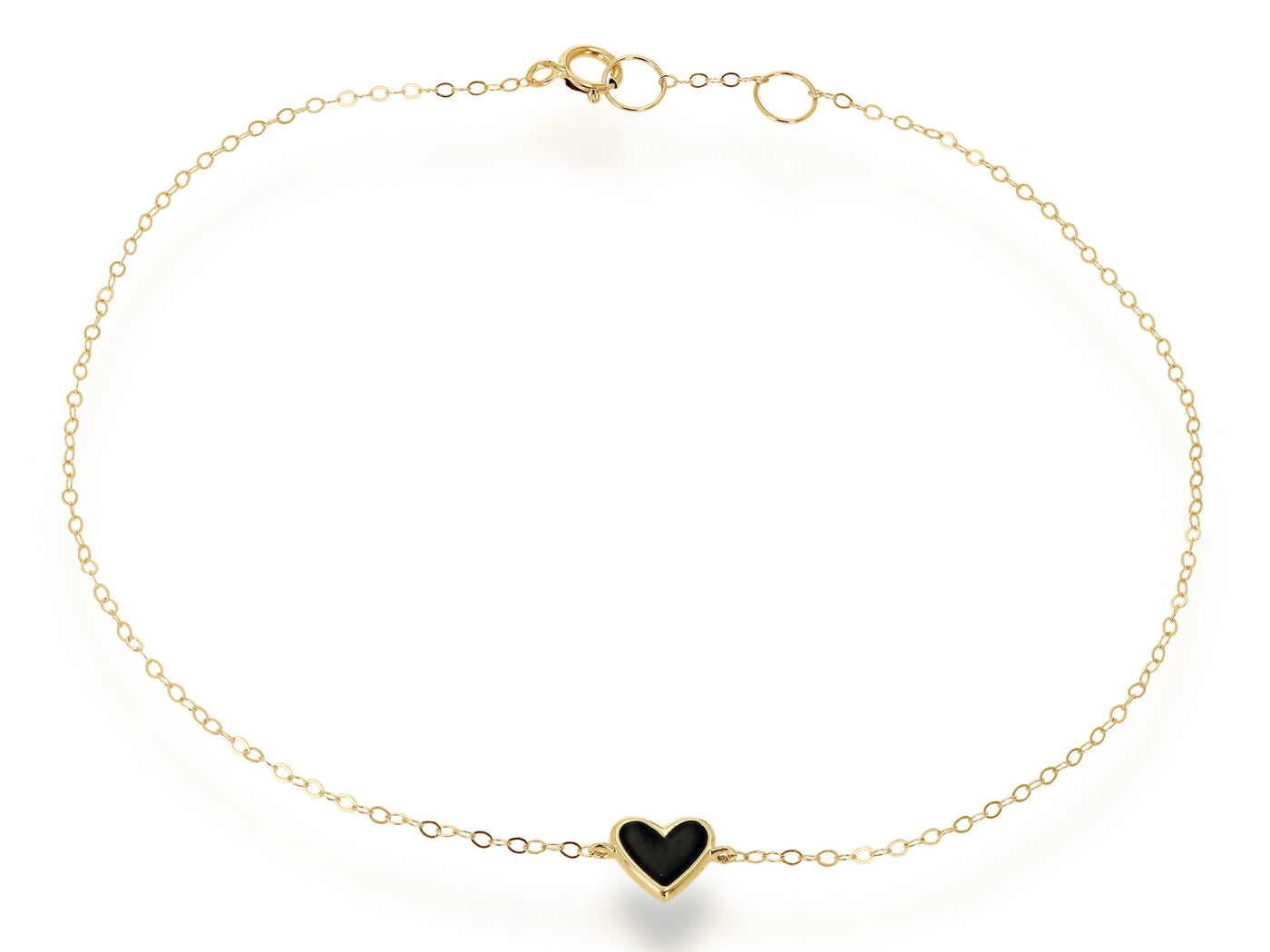 This exquisite Mini Enamel Black Heart Chain Anklet is crafted from 14-karat yellow gold and delicately measures from 9-9.5" long.