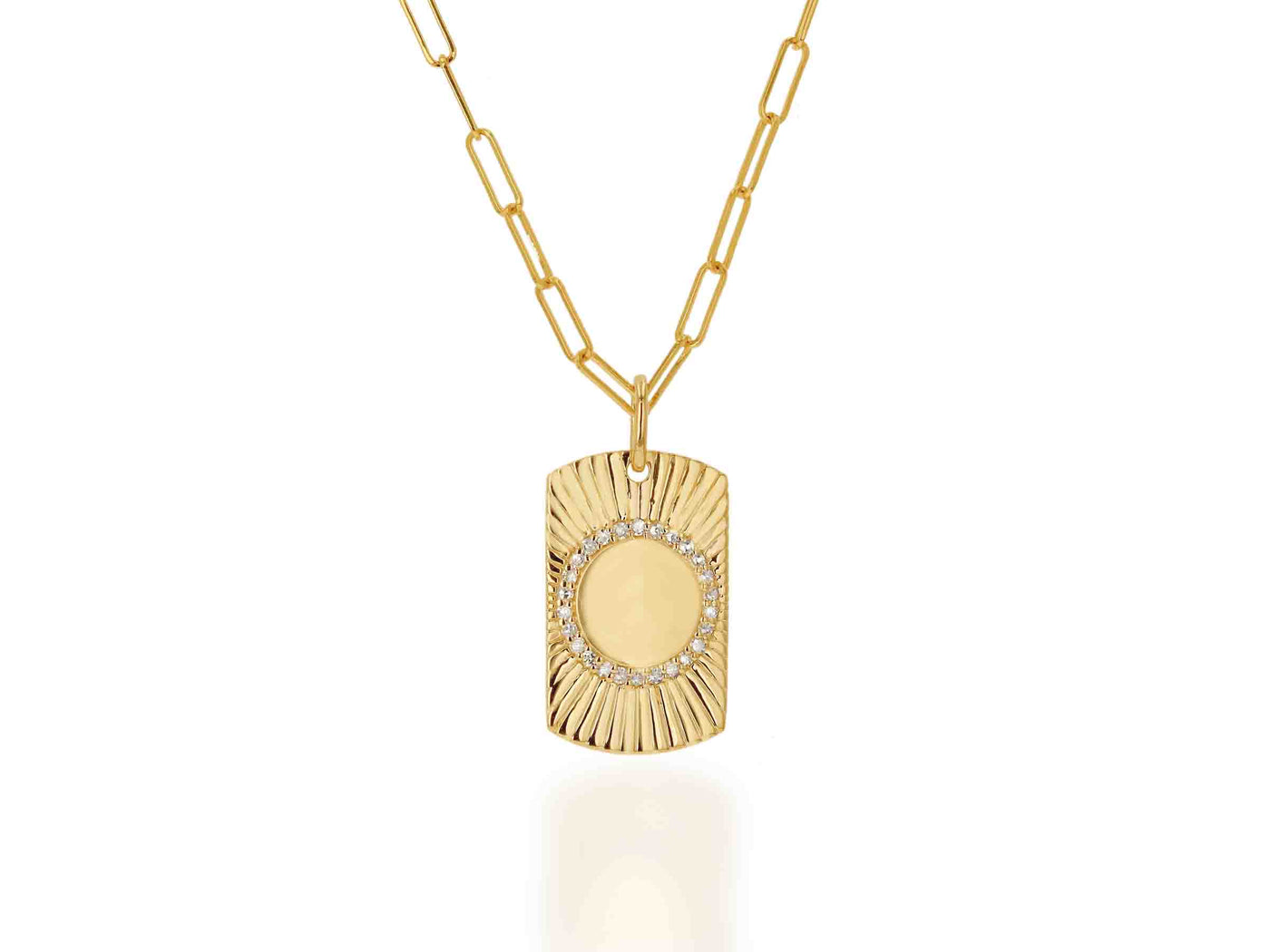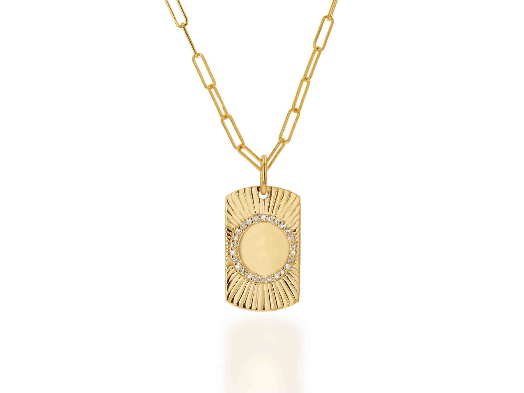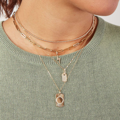 Presenting the Diamond Tag Charm, a luxurious adornment crafted from 14k yellow gold. Boasting a stunning 0.14 average carat weight, the Tag measures 0.75" long and 0.5" wide. The chain is our 16" micro mini link gold chain necklace.