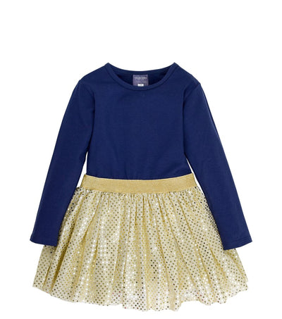 Toobydoo presents the Irina Party Dress. The ultimate mix of twirl and comfort, it's every little girl's dream dress. A navy blue jersey knit top meets a tulle skirt adorned with shimmering gold dots. The finishing touch? A sparkly elastic waistband. And for easy care, just toss it in the wash and hang it to dry.