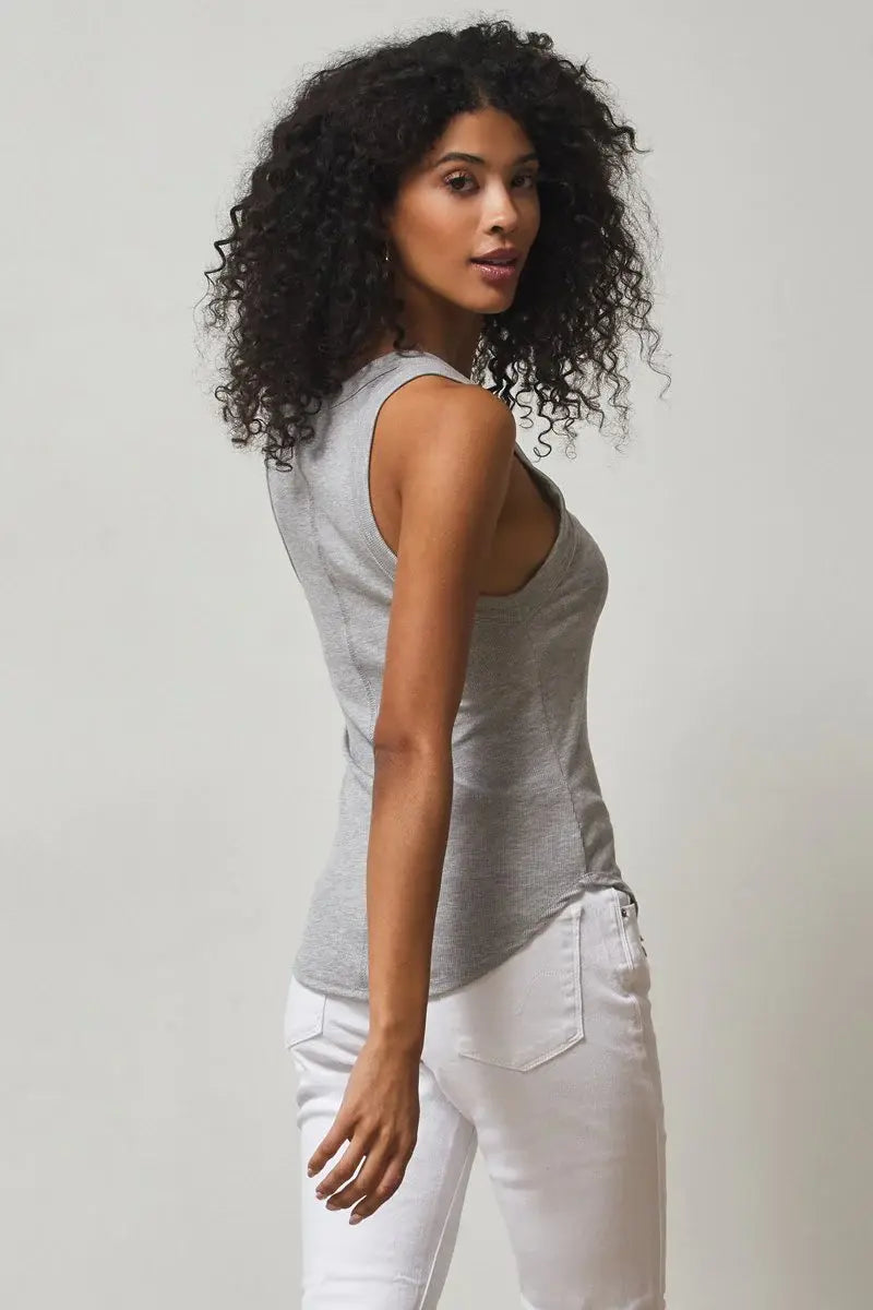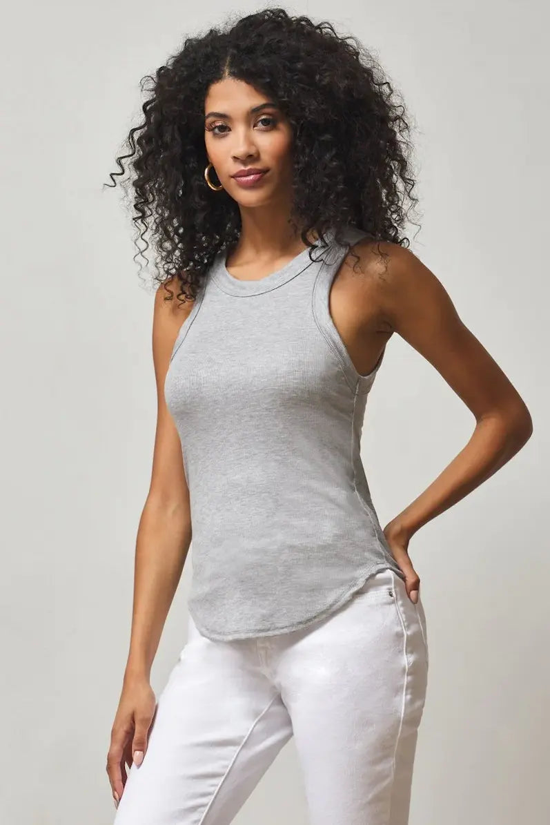 A timeless tank. This sleek racer front style can be worn to any situation imaginable. Layer it under a blazer for a business event, slip it on after your workout, or style it with distressed denim and booties for a relaxed night out. Heather Gray ribbed texture for flexibility, luxurious softness, and preshrunk to ensure it never shrinks in the wash.