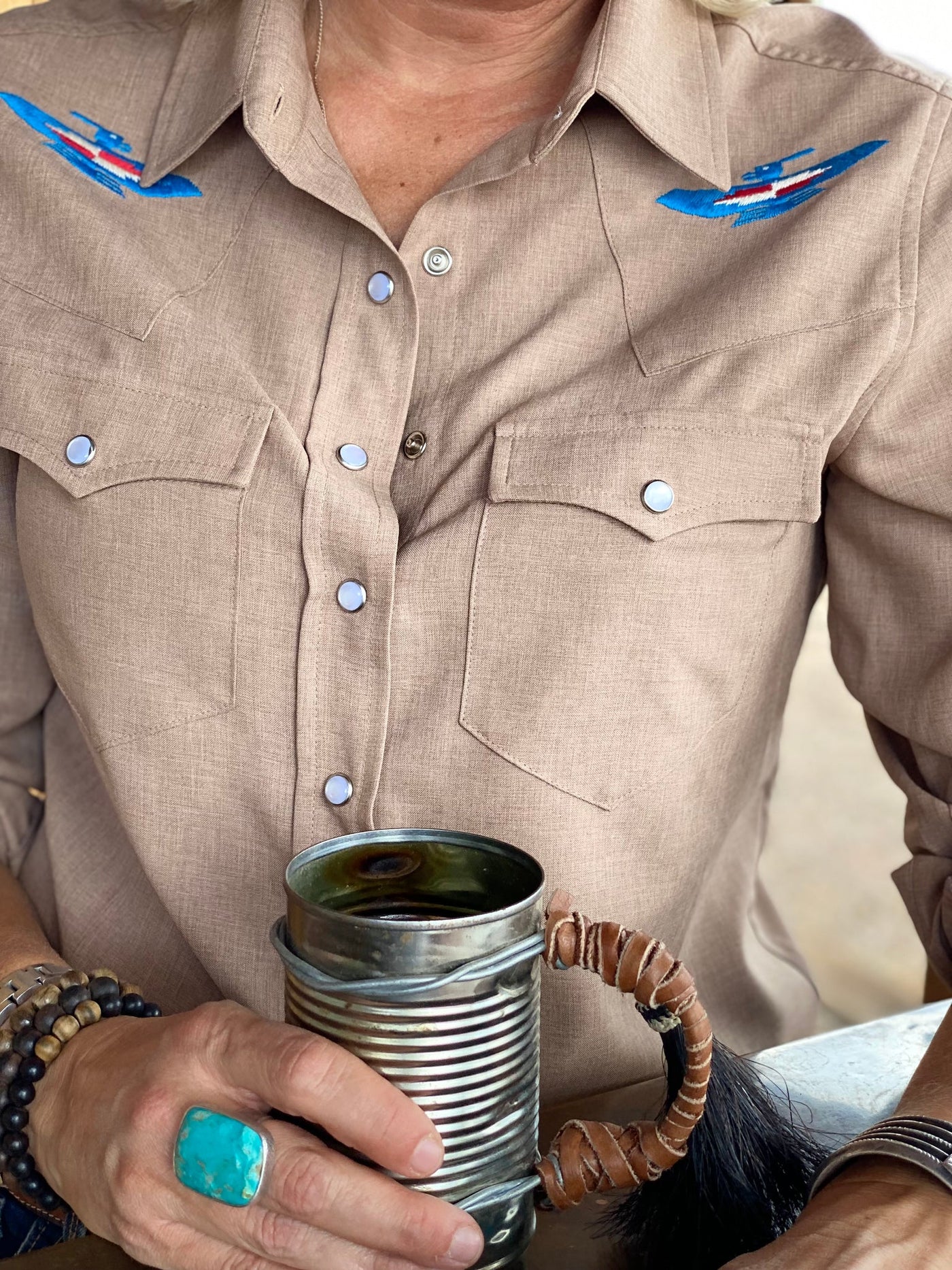 Inspired by women who light their own fire and blaze their own trail, it can be worn year around under the sun and stars. Hand embroidered details add a little sparkle to the look!